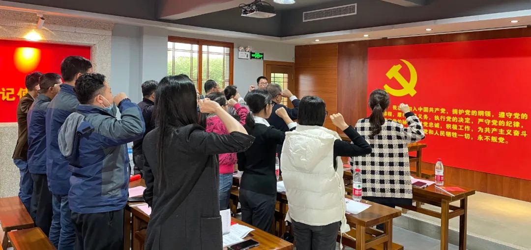 “我志愿加入中国共产党,拥护党的纲领,遵守党的章程,履行党员义务,执行党的决定,严守党的纪律……”面对鲜艳的党旗,全体党员,高举右手、庄严宣誓,开展重温入党誓词活动。随后,大家齐声高唱《没有共产党就没有新中国》,用歌声表达对党的忠诚与热爱。