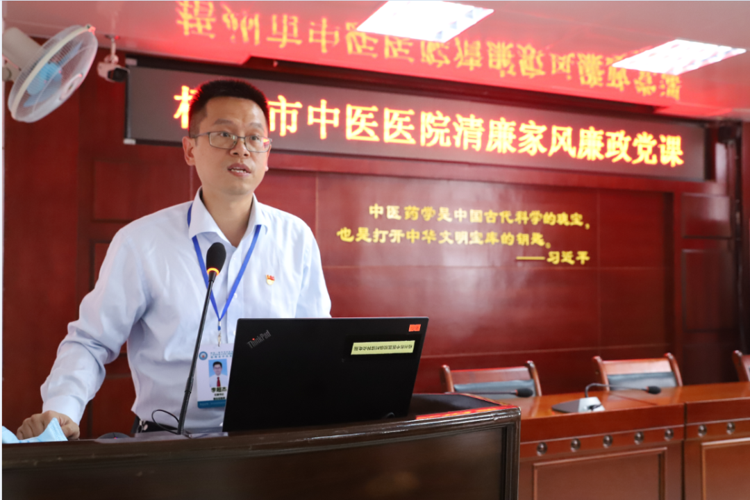 医院党委书记梁平以《坚守廉洁底线 弘扬传统家风》为主题,阐述了家风是干部作风的重要表现,强调党员干部必须率先垂范,树立知礼仪、懂廉耻、重美德、讲规矩的良好家风,争做良好家风建设的带头人和廉洁为民的践行者。