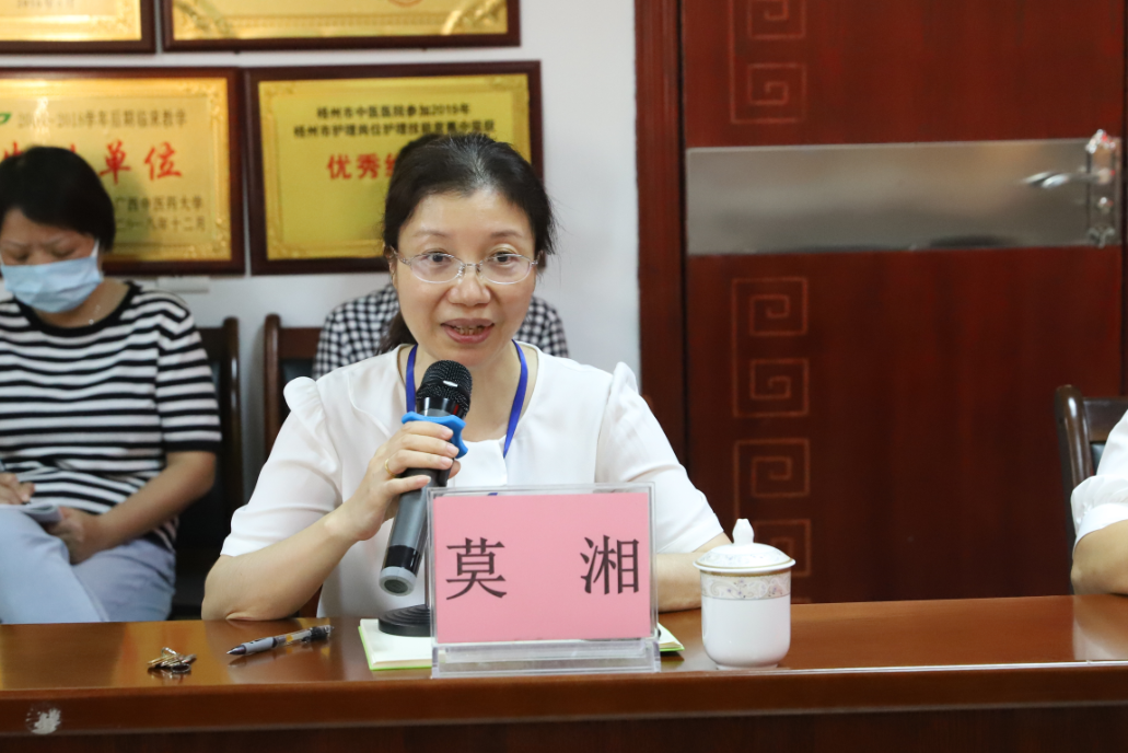 在调研座谈会上,副院长莫湘强调护理服务质量是医疗工作的重点,也是医院业务规范开展的最基础保障,希望通过此次调研,医院护理工作在广西中医护理质控中心的指导下能够更加科学、规范,推动中医护理工作再上新台阶。