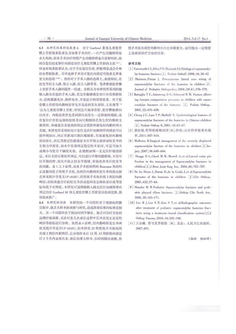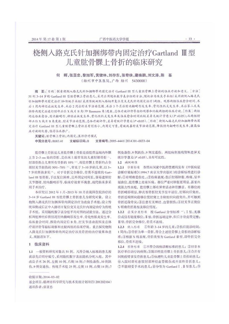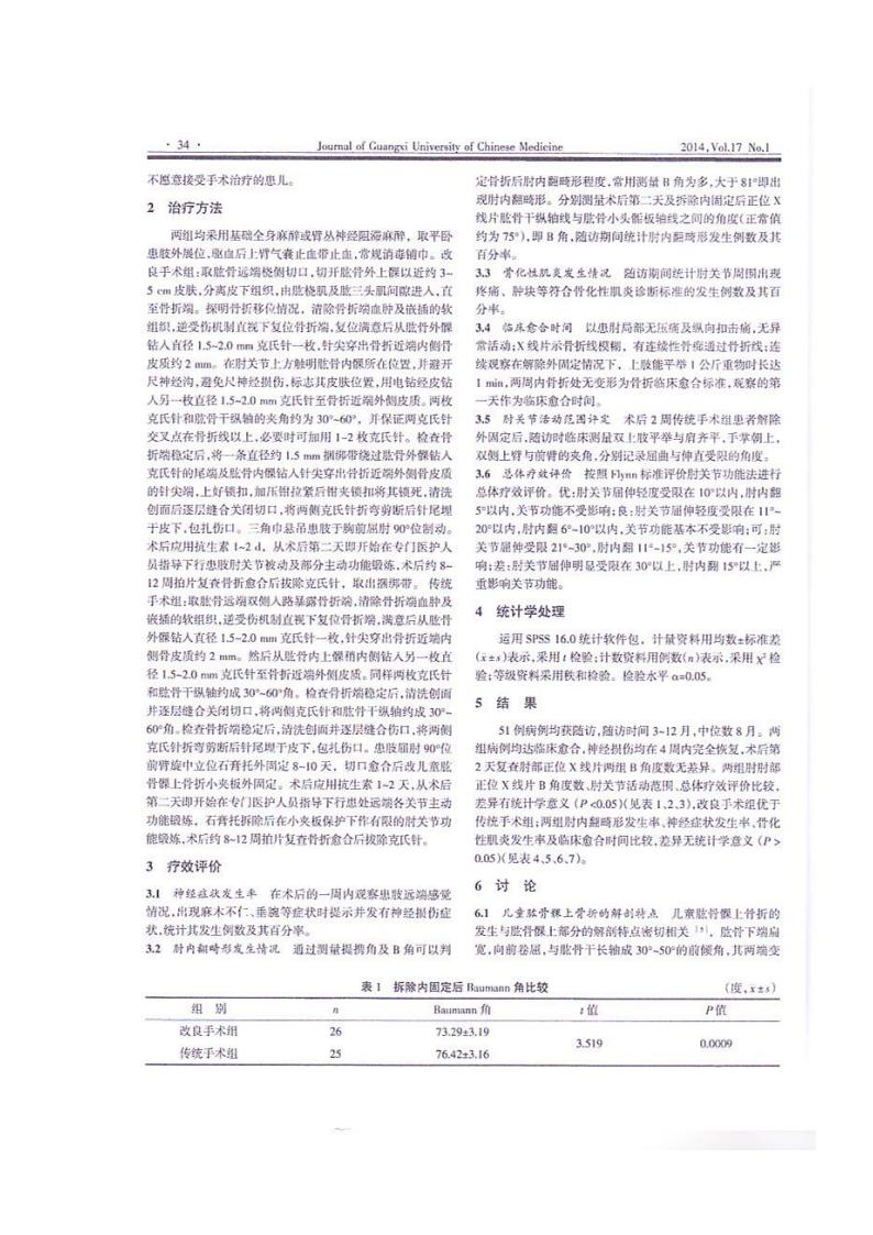 论文-桡侧入路克氏针加捆绑带内固定治疗Gartland Ⅲ 型儿童肱骨髁上骨折的临床研究