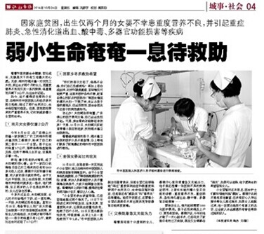 怎么办?夫妇俩当即商量,广东佛山的医疗费用太高,自己远远负担不起。可是,亲生骨肉怎能够轻言放弃?于是,10月19日,夫妇俩只好赶紧带着小孩回到老家,找到倒水镇卫生院救治。