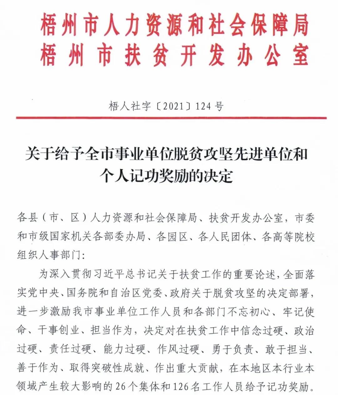 目前,梧州市人力资源和社会保障局、梧州市扶贫开发办公室联合下发的《关于给予全市事业单位脱贫攻坚先进单位和个人记功奖励的决定》,对26个集体和126名工作人员给予记功奖励。其中,梧州市中医医院荣获梧州市事业单位脱贫攻坚先进单位,这是对我院脱贫攻坚工作的充分肯定。