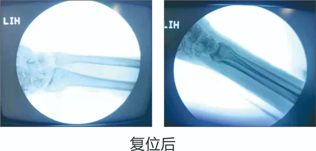 做好充分准备后,9月12日,在岭南中医药研究所副所长唐健强的配合下,医院岭南中医骨伤医派学术带头人、梧州名中医罗世东使用巧劲,非常熟练地完成了牵拉、折顶、端提等一系列动作,快速顺利地完成了复位,整个复位过程,刘大爷并未感觉到明显的疼痛。小夹板外固定后,通过C臂机透视显示:左桡骨远端骨折及下尺桡关节脱位已经复位,外固定位置准确,达到预期效果。