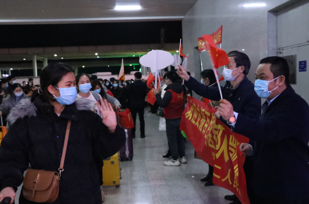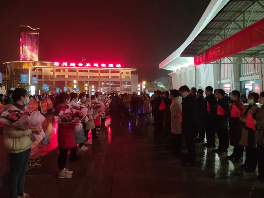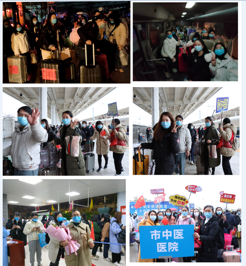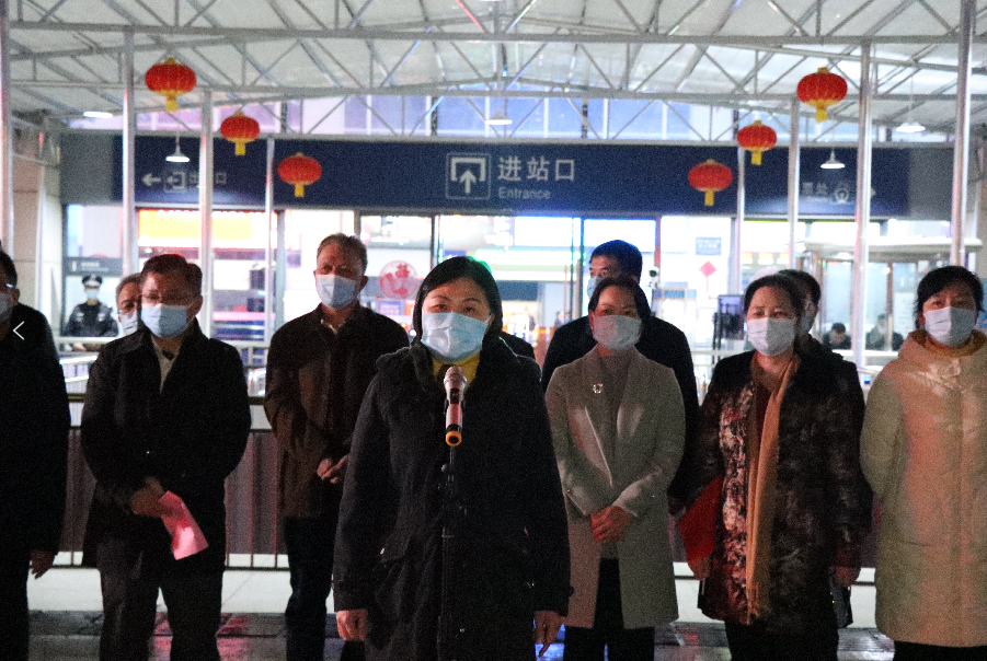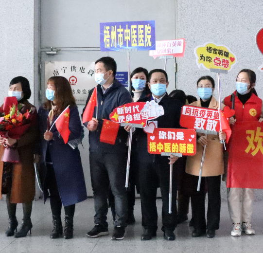 市中医医院院长卢正、副院长莫湘带领职工代表们早早守候在出站口平台道路两旁,拉着温暖标语,迎接着英雄的归来。