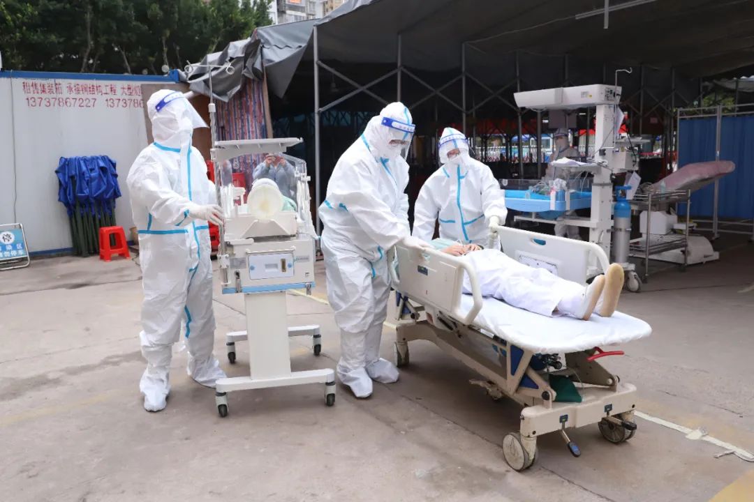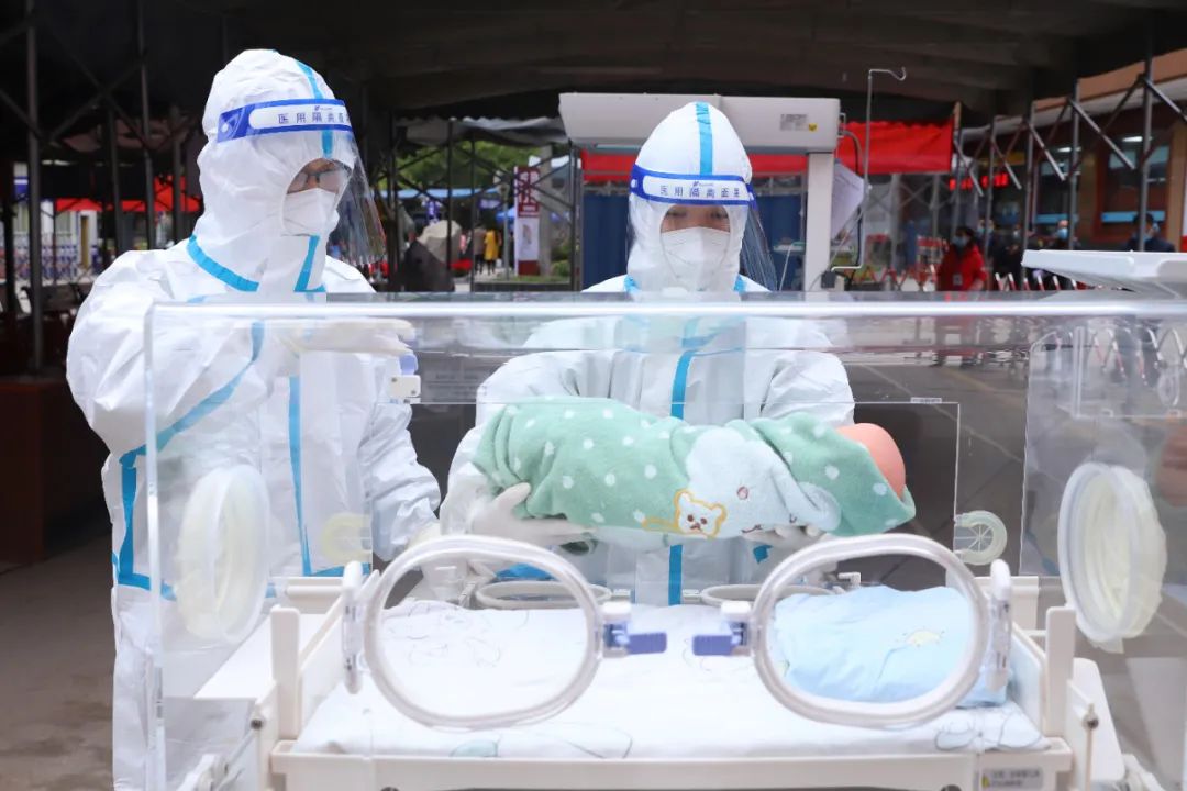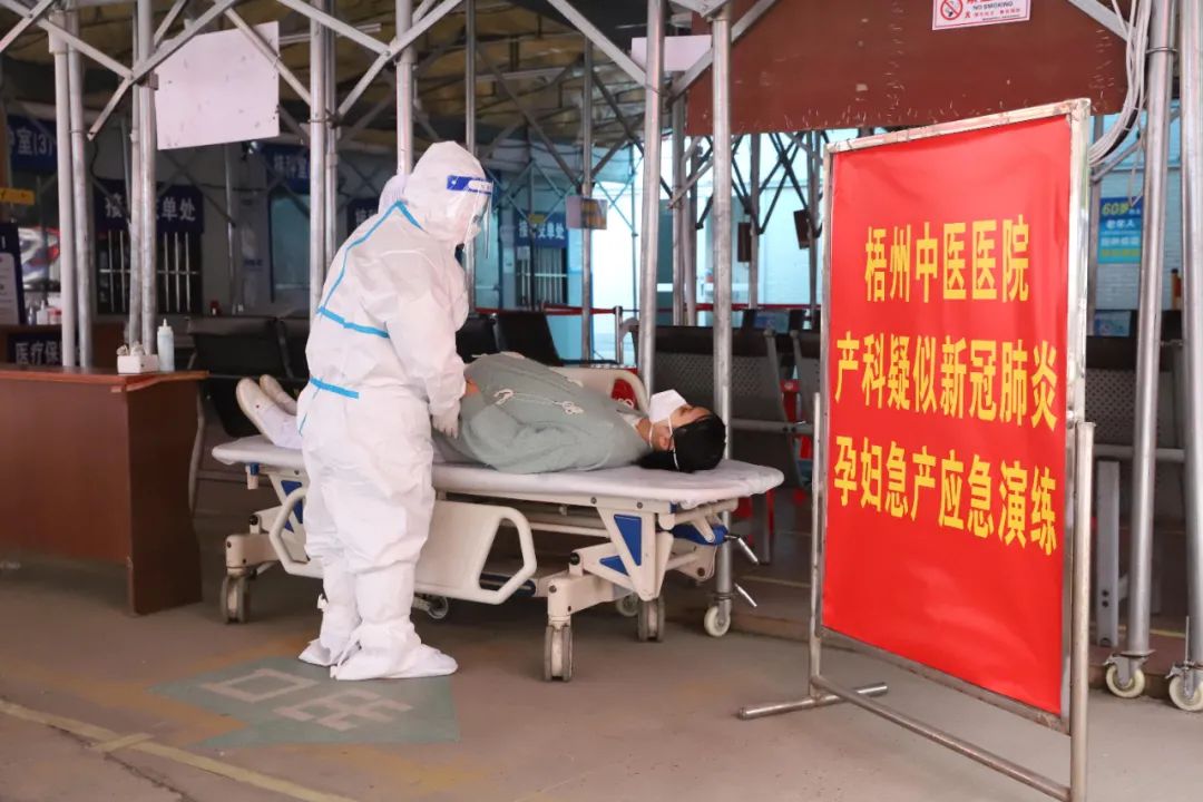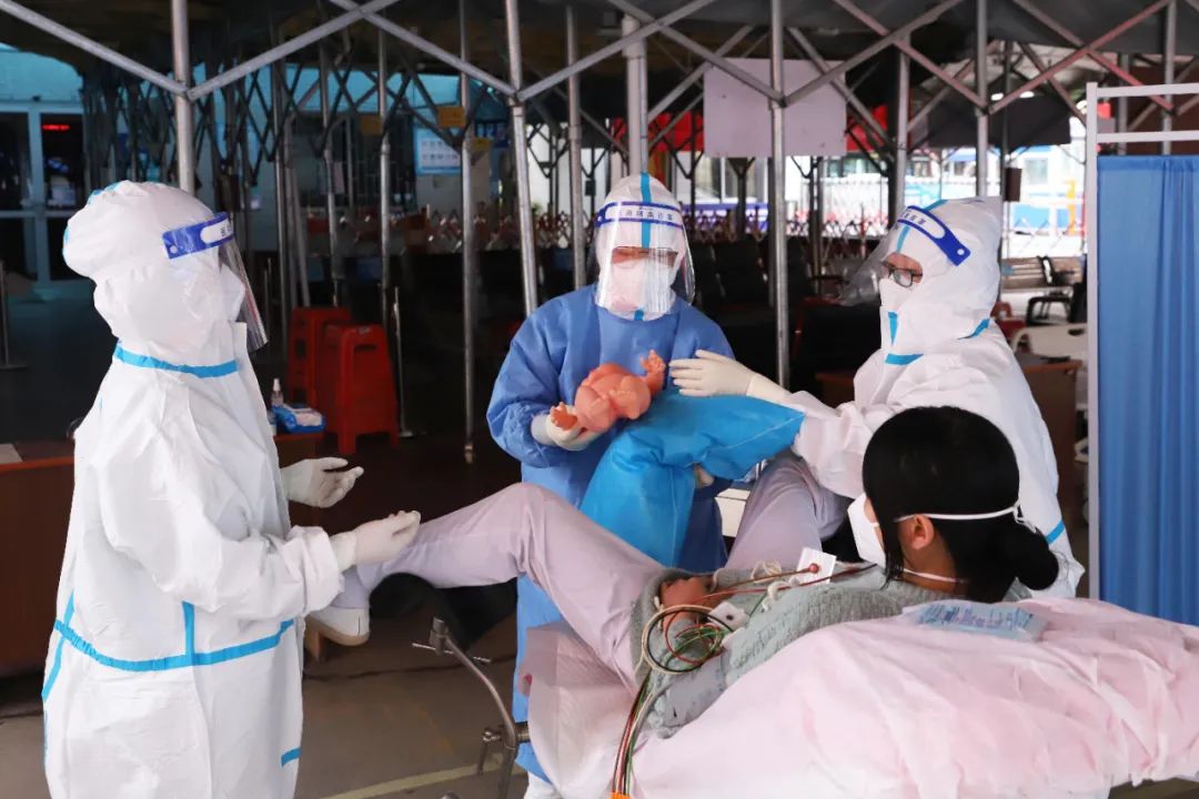 本次演练模拟了一名孕周39+3的新型冠状病毒肺炎疑似患者,因发热、腹痛伴阴道流液1小时,来院我院就诊。经产科医生检查后,由于孕妇短时间会分娩,无法转至第三人民医院,需在我院分娩,医院立即启动应急预案,孕产妇经专用通道转运至产房隔离分娩间。