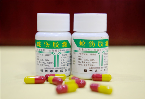 【功能主治】清热解毒,消肿止痛,用于感冒发热、头痛、目赤肿痛、腮腺炎、鼻衄、咽喉肿痛。 【规 格】10g×15袋/包。 ![]() 蛇药酒 【功能主治】解毒止痛、消肿。用于各种蛇、毒虫咬伤,热痒等症。 【规 格】100ml/瓶。 【用法用量】口服。每日4~6次,每次15~30m1。 外用:涂患处。 【批准文号】桂药制字Z04060014 ![]() 蛇伤胶囊
