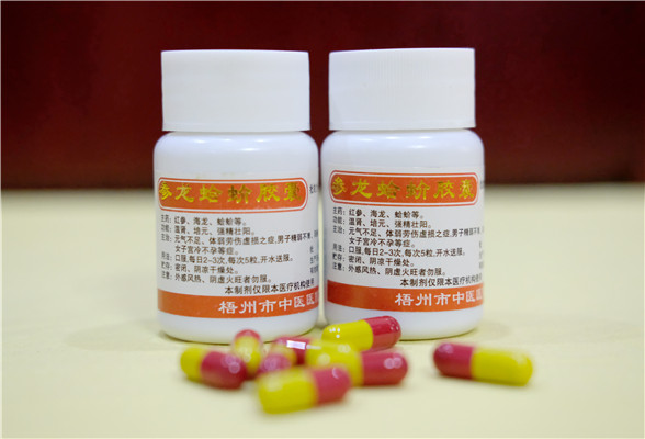 【功能主治】补肾强精壮阳,用于男女肾精亏虚,劳伤之症,婚久不孕,阳痿早泄等症。 【规 格】6g×10丸/盒。 【用法用量】口服 。每次1丸,每日3~4次。 【注 意】感冒发热勿服。 【批准文号】桂药制字Z04060056 ![]() 参龙蛤蚧胶囊 【功能主治】温肾培元,强精壮阳,用于元气不足,老年体弱,劳伤虚损之症,男子精弱不育,阳痿早泄;女子宫冷不孕,带下清稀等症。 【规 格】0.3g×30粒/瓶。 【用法用量】口服。每次5粒,每日2~3次。 【注 意】外感风热,阴虚火旺者勿服。 【批准文号】桂药制字Z04060059 ![]() 水蛭胶囊