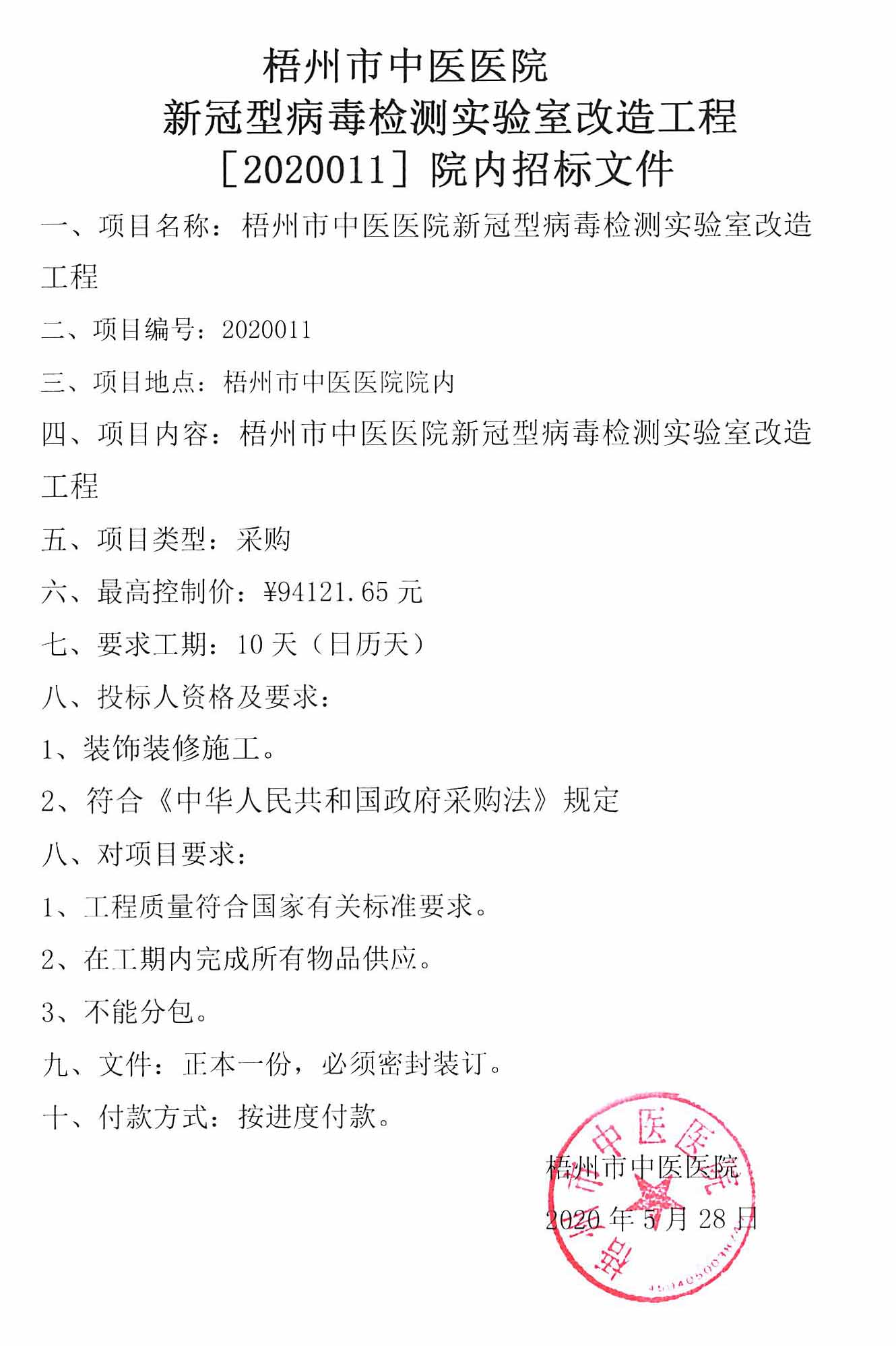 梧州市中医医院新冠病毒检测实验室改造工程【2020011】院内招标文件