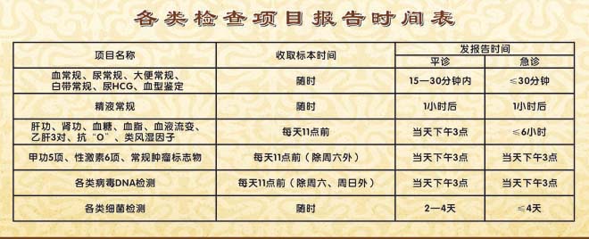 我院检验科可开展肝功、肾功、血脂、血粘、乙肝检查、血常规、尿常规、糖尿病筛查或确诊、病毒DNA等生化、免疫、血液、体液、微生物、分子生物学等六大类250多个检查项目,检验结果咨询电话:0774-3925091,各类检查项目报告时间如下: